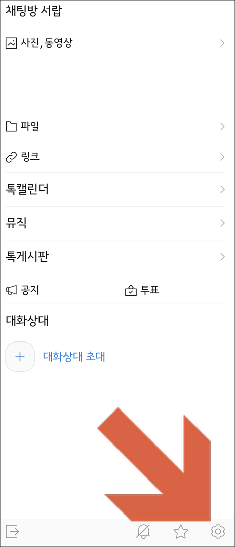 우선 카카오톡 대화내용 삭제를 원하는 채팅방 상단 오른쪽의 삼선 메뉴를 클릭합니다. 그럼 아래 화면처럼 채팅방 서랍이 등장하는데요 그곳에서 맨아래 오른쪽에 있는 톱니바퀴 모양의 아이콘을 터치(클릭)합니다.