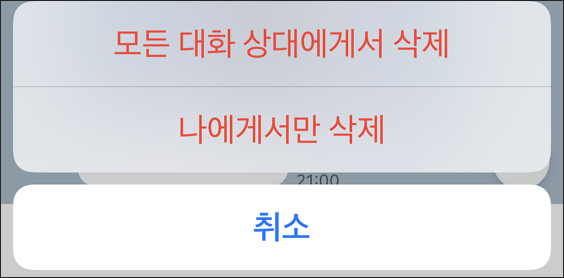 그렇다면 아래와 같은 선택 메뉴가 나타납니다. 모든 대화상대에게서 삭제할지 아니면 나에게서만 삭제할지 묻고 있습니다. 본인이 원하는 메뉴를 선택해 줍니다. 보통 모든 대화 상대에게서 삭제를 위해서 이 기능을 많이 활용합니다.