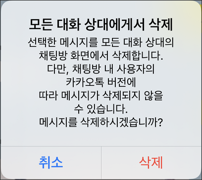 삭제된 메시지는 복구할 수 없으며, 위 경고문처럼 카카오톡 버전에 따라 메시지가 삭제되지 않을 수 있기 때문에 최신버전의 카카오톡으로 업데이트를 항상 해주는걸 추천드립니다.
