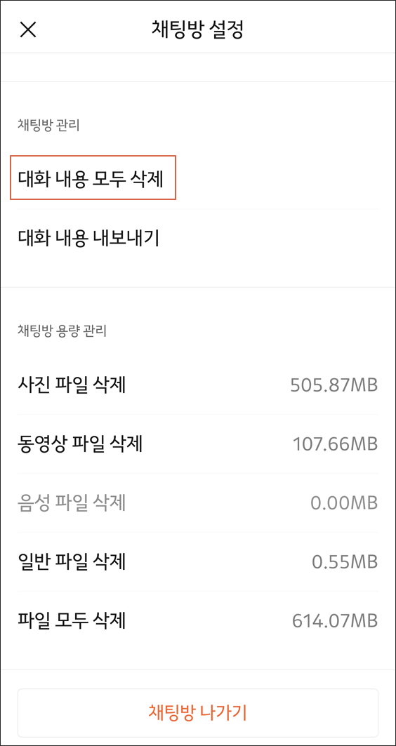 이제 채팅방 설정 메뉴가 화면전체로 나옵니다. 그곳에서 채팅방 관리 부분 아래에 있는 대화 내용 모두 삭제를 눌러주면 '현재 채팅방의 모든 대화내용을 삭제하시겠습니까?' 라는 질문과 함께 대화 내용 모두 삭제와 취소 버튼이 등장합니다.
