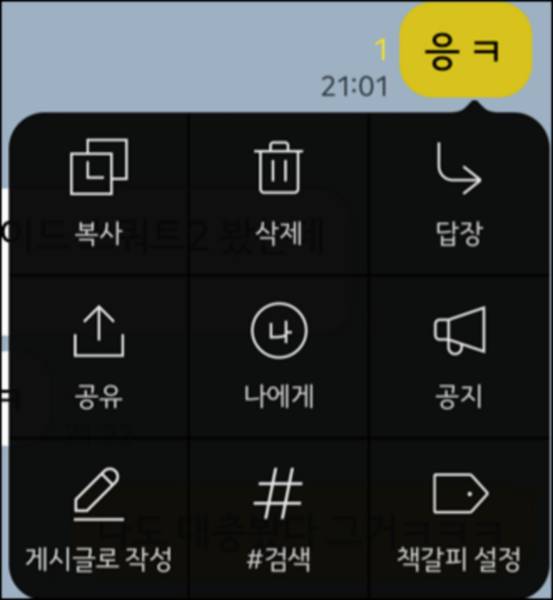 본인 카카오톡에 로그인 한후, 본인이 취소하고 싶은 보낸 메세지를 길게 터치해줍니다. 해당 메세지를 꾹 눌러주면 아래와 같은 팝업 메뉴가 등장합니다. 그중에서 윗줄 가운데에 위치한 삭제를 눌러줍니다.